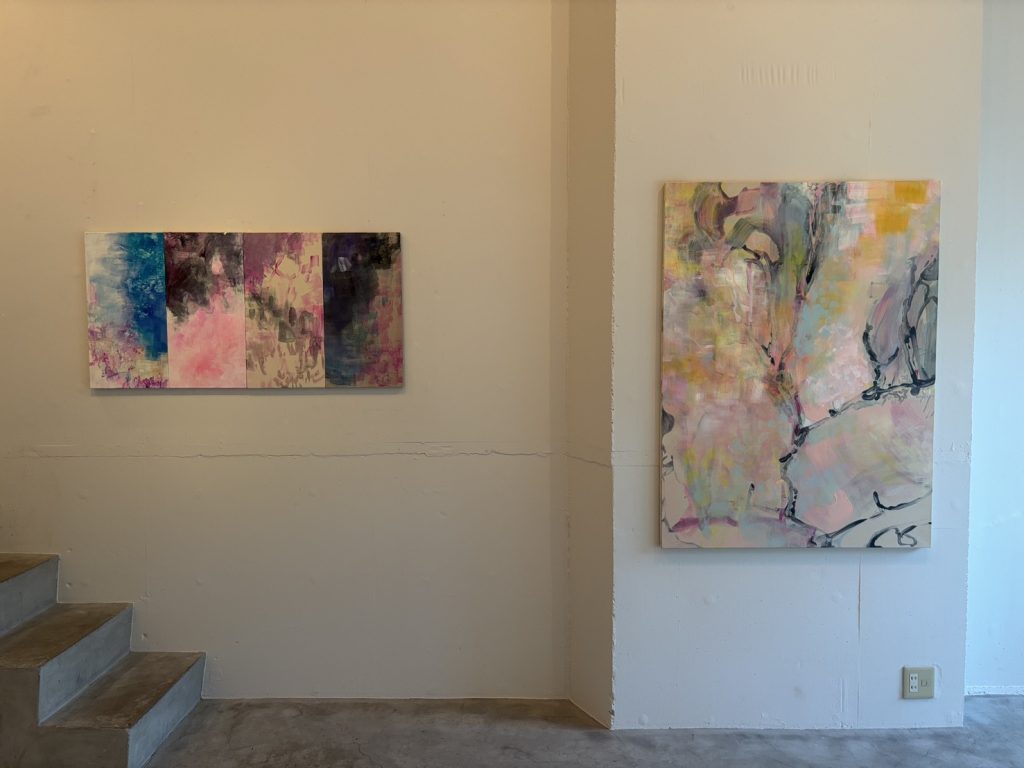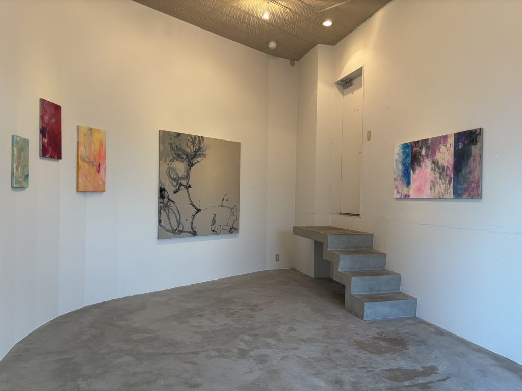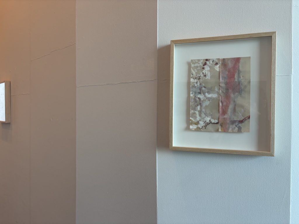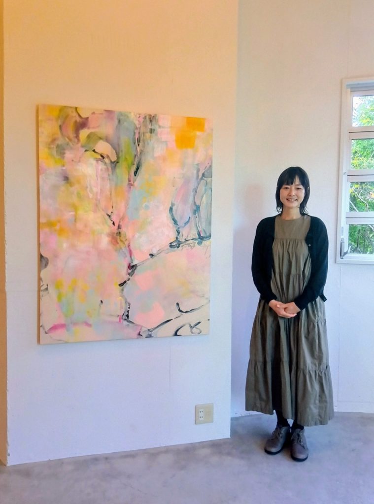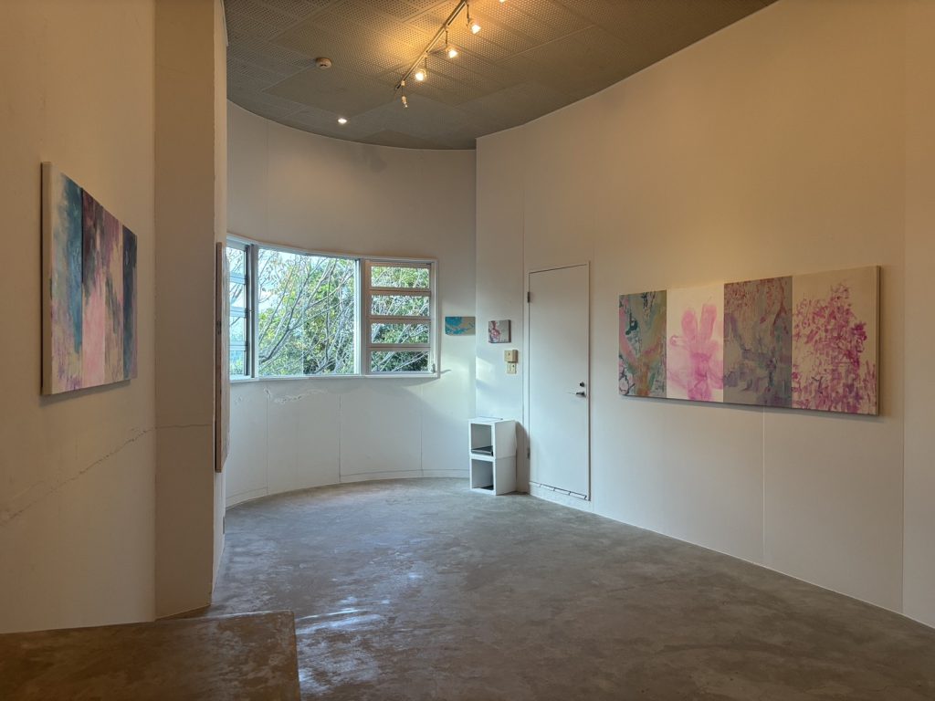 本展に向けて、昨年3月にスイスでの滞在制作時に描いた1本のマグノリアのスケッチを基に新作を制作しました。スイスという見知らぬ土地でその樹を眺めた時間はほんの少しですが、天空から柔らかに降り注ぐ早春の雨と光、開きゆく花、その開花を待つ人々とともに、光と地面との間にある交々、物事と人々と植物と紡がれ流れた時間そのものが、スケッチを通して浮かび上がってきて、それらを絵画の軸にしたいと考えました。長くそこに立つ一本の樹と共にある人々の暮らし、地面でつながり、どこにいても同じ太陽を受けて生きていること、大きさは全く違いますが、桜島のことを想いました。