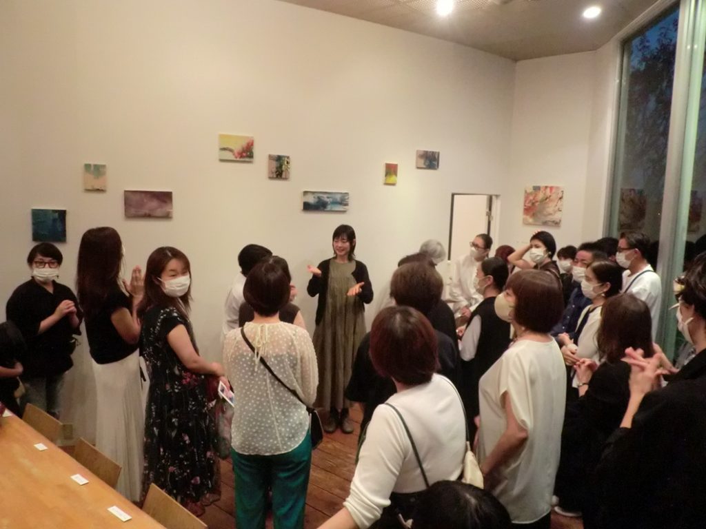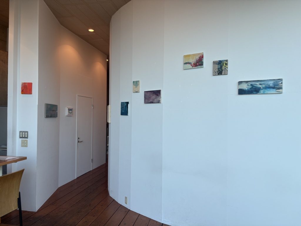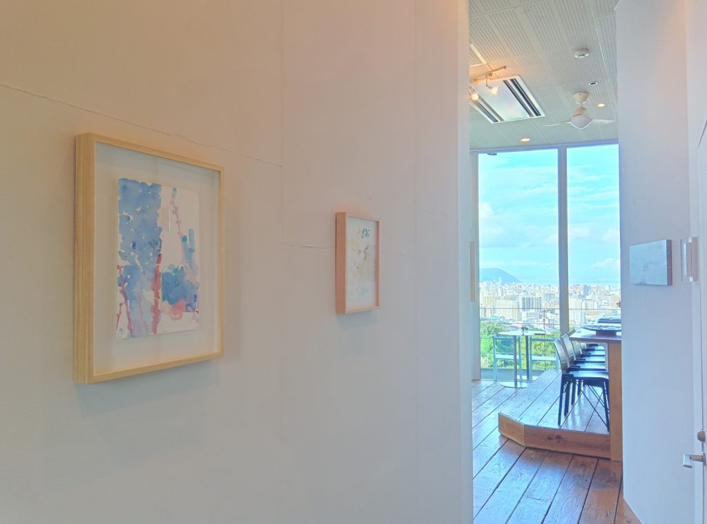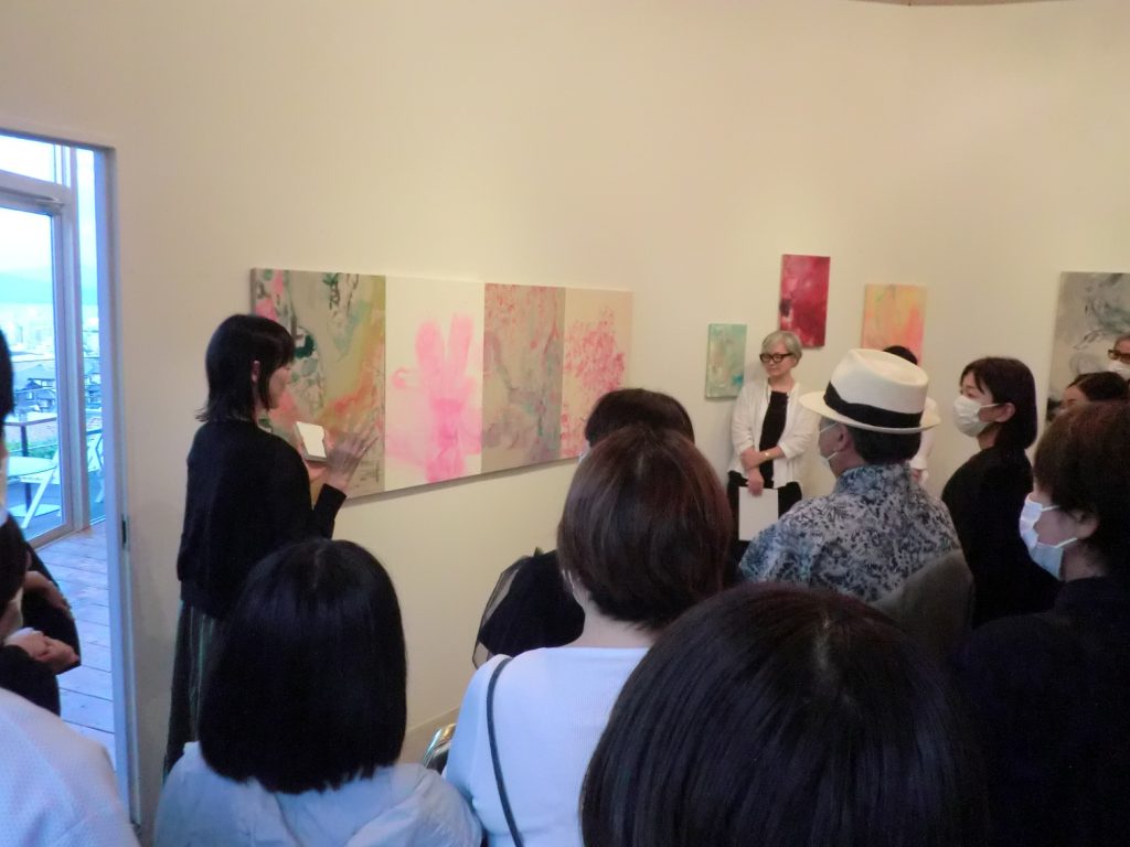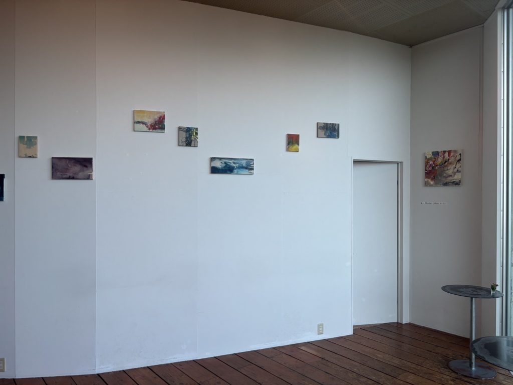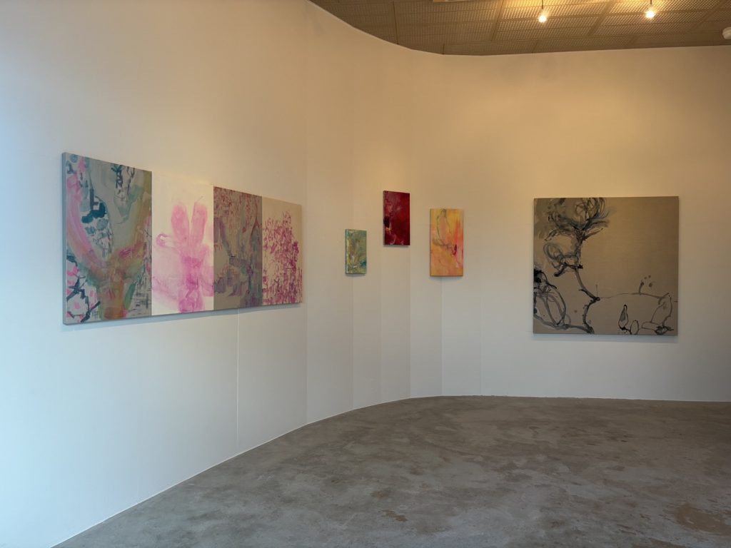 本展に向けて、昨年3月にスイスでの滞在制作時に描いた1本のマグノリアのスケッチを基に新作を制作しました。スイスという見知らぬ土地でその樹を眺めた時間はほんの少しですが、天空から柔らかに降り注ぐ早春の雨と光、開きゆく花、その開花を待つ人々とともに、光と地面との間にある交々、物事と人々と植物と紡がれ流れた時間そのものが、スケッチを通して浮かび上がってきて、それらを絵画の軸にしたいと考えました。長くそこに立つ一本の樹と共にある人々の暮らし、地面でつながり、どこにいても同じ太陽を受けて生きていること、大きさは全く違いますが、桜島のことを想いました。
